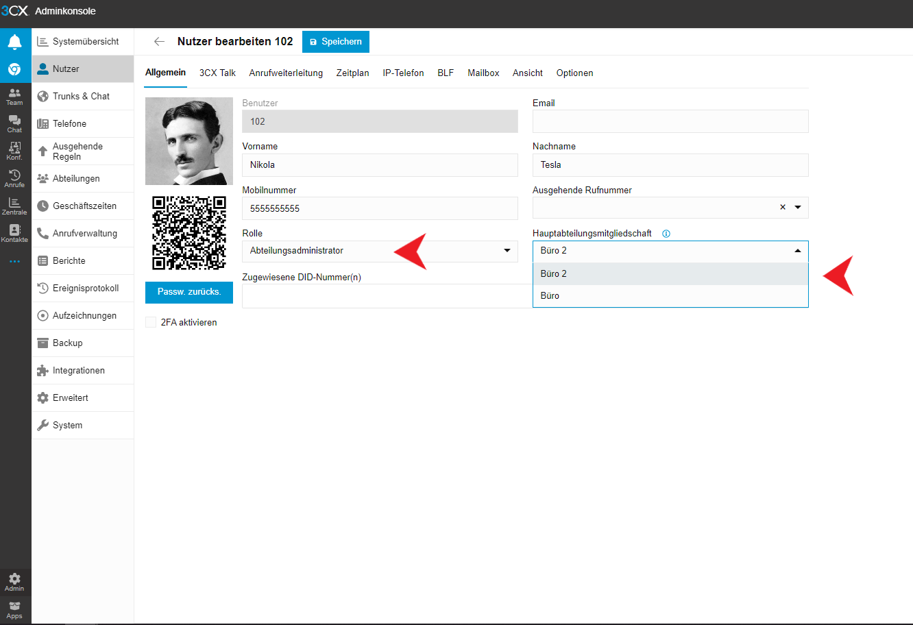 Zusätzlich besteht die Möglichkeit, bestimmten Benutzern die Verwaltung bestimmter Abteilungen zu übertragen. Dadurch kann die Administration bei mehreren Firmen auf einer gemeinsamen Anlage aufgeteilt werden. Nutzer, denen die Rolle des Abteilungsadministrators zugewiesen wurde, können nur die Benutzer sehen und verwalten, die sich in ihrer Gruppe oder Abteilung befinden. Ebenso sind sie berechtigt, nur Einstellungen zu ändern, die in ihre Abteilung fallen, wie beispielsweise Öffnungszeiten, SIP-Trunks, und weitere Einstllungen. Für die User ohne Adminrecht gibt es keine sonderlichen Veränderungen.